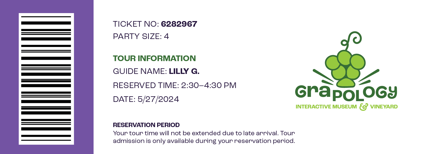 The finished logo consists of a bundle of grapes crashing against the name “Grapology”, displacing the “pol”. This ties back to the museum’s unique grape production process, which involves our visitors smashing and crushing grapes into jams and juices. To further express this, I added small expression marks on either side of the grapes to represent the juice that is pressed out from this process.